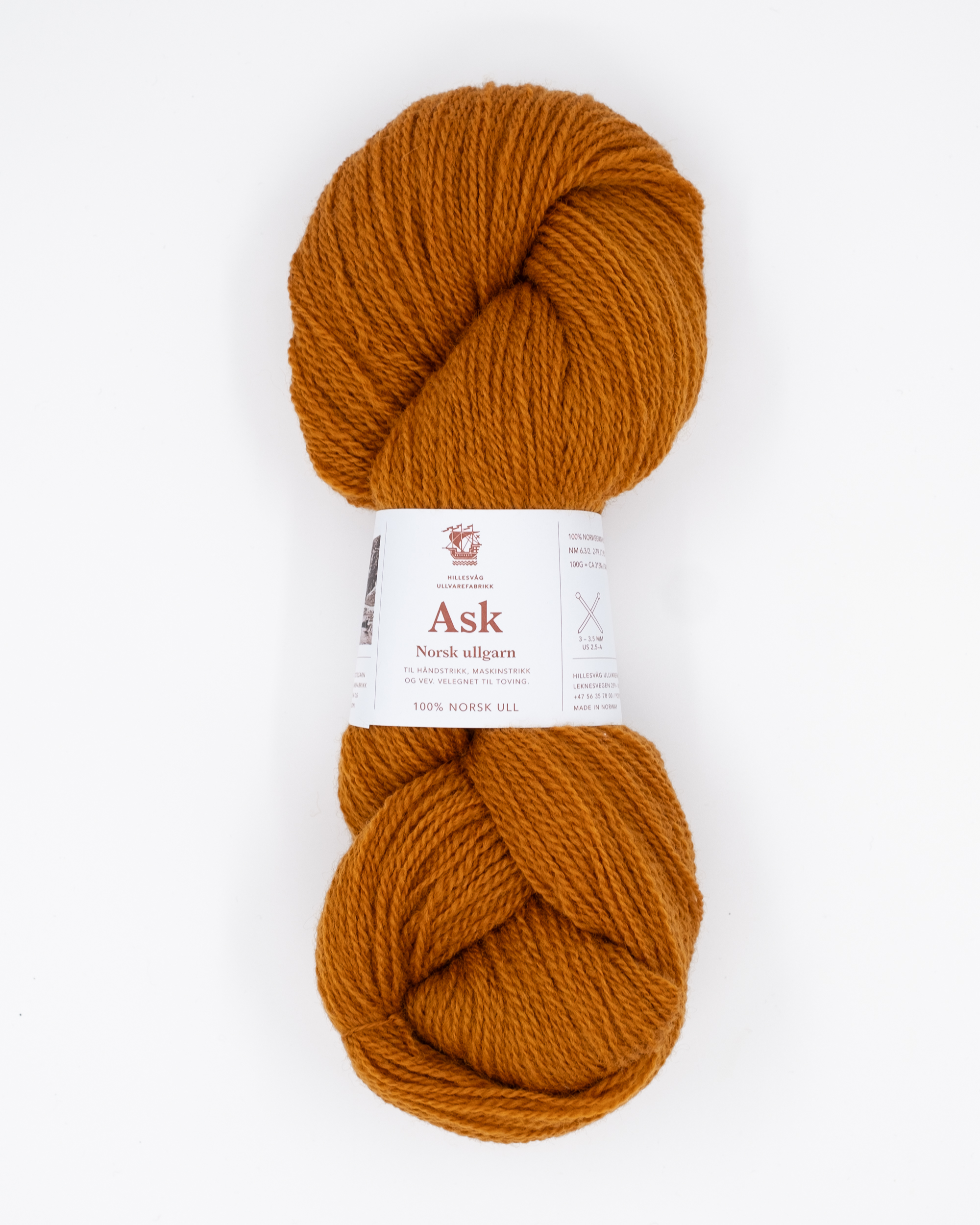 Ask ullgarn er et 2-trådet, drøyt og luftig kardegarn. Garnet er spunnet av 100% norsk ull. Ask ullgarn egner seg godt til plagg både til barn og voksne, de blir lette og varmer godt. Garnet er også velegnet til toving eller til veving.