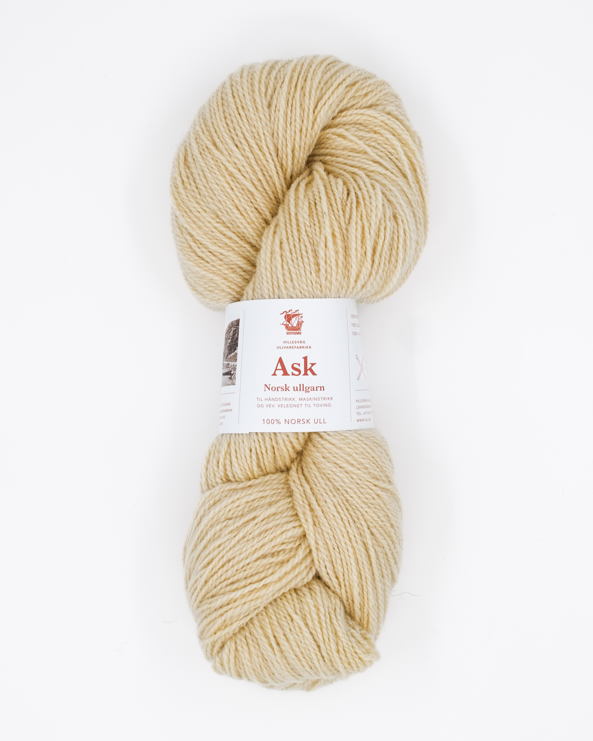 Ask ullgarn er et 2-trådet, drøyt og luftig kardegarn. Garnet er spunnet av 100% norsk ull. Ask ullgarn egner seg godt til plagg både til barn og voksne, de blir lette og varmer godt. Garnet er også velegnet til toving eller til veving.